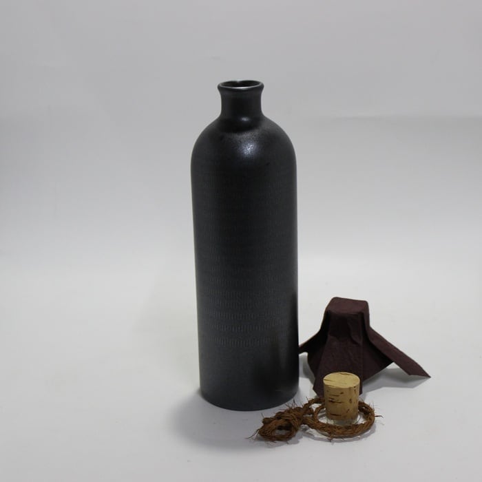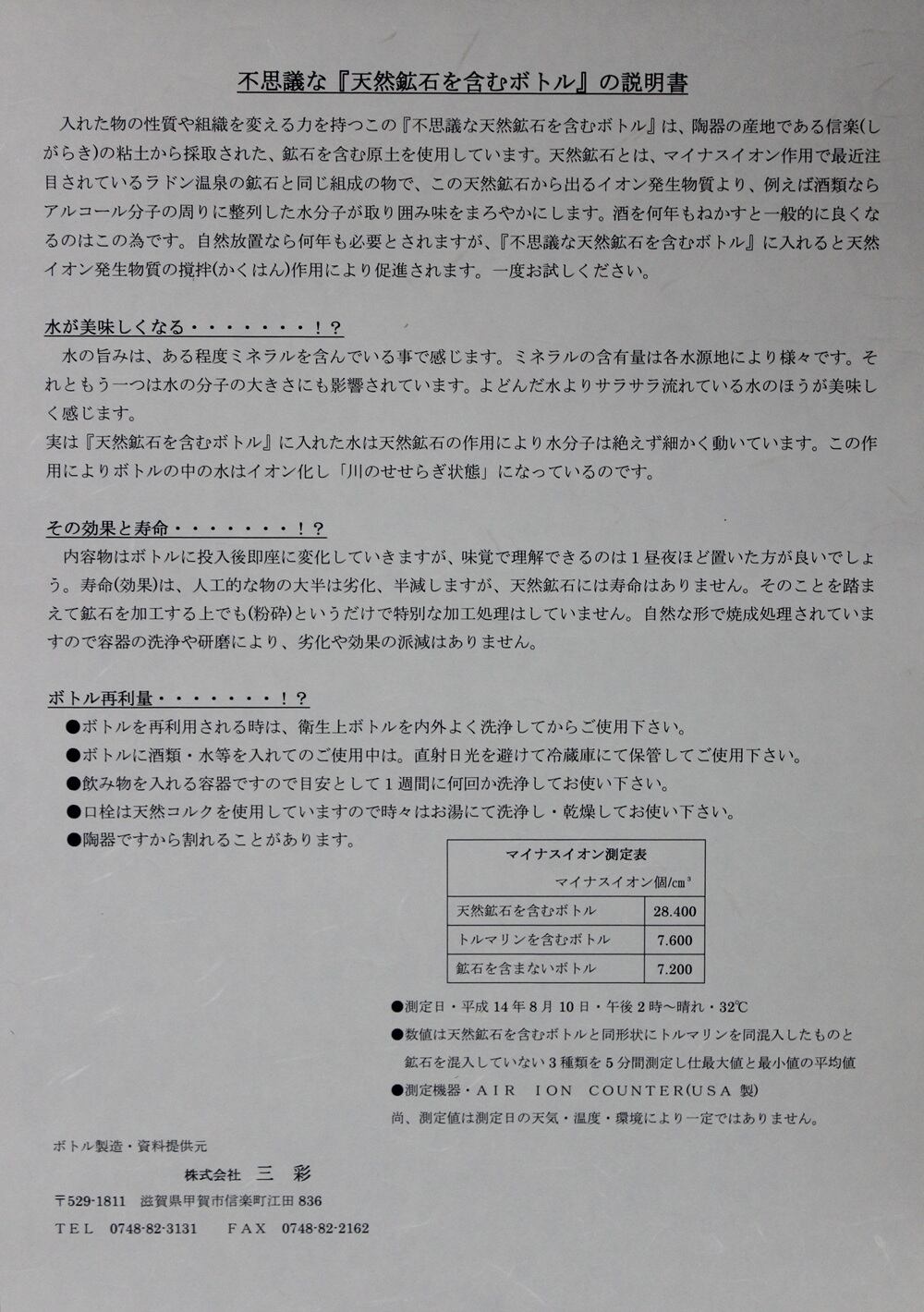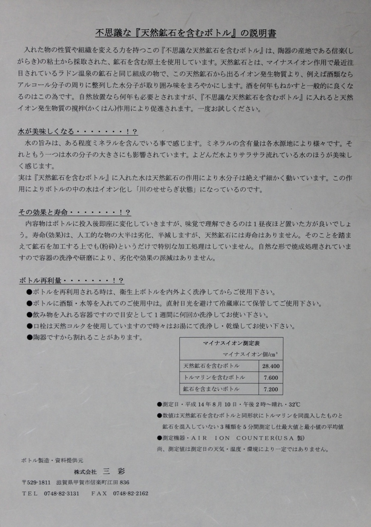 入れた物の性質や組織を変える力を持つこの『不思議な天然鉱石を含むボトル』は、陶器の産地である信楽(しがらき)の粘土から採取された、鉱石を含む原土を使用しています。天然鉱石とは、マイナスイオン作用で最近注目されているラドン温泉の鉱石と同じ組成の物で、この天然鉱石から出るイオン発生物質より、例えば酒類ならアルコール分子の周りに整列した水分子が取り囲み味をまろやかにします。酒を何年もねかすと一般的に良くなるのはこの為です。自然放置なら何年も必要とされますが、『不思議な天然鉱石を含むボトル』に入れると天然イオン発生物質の撹拌(かくはん)作用により促進されます。一度お試しください。